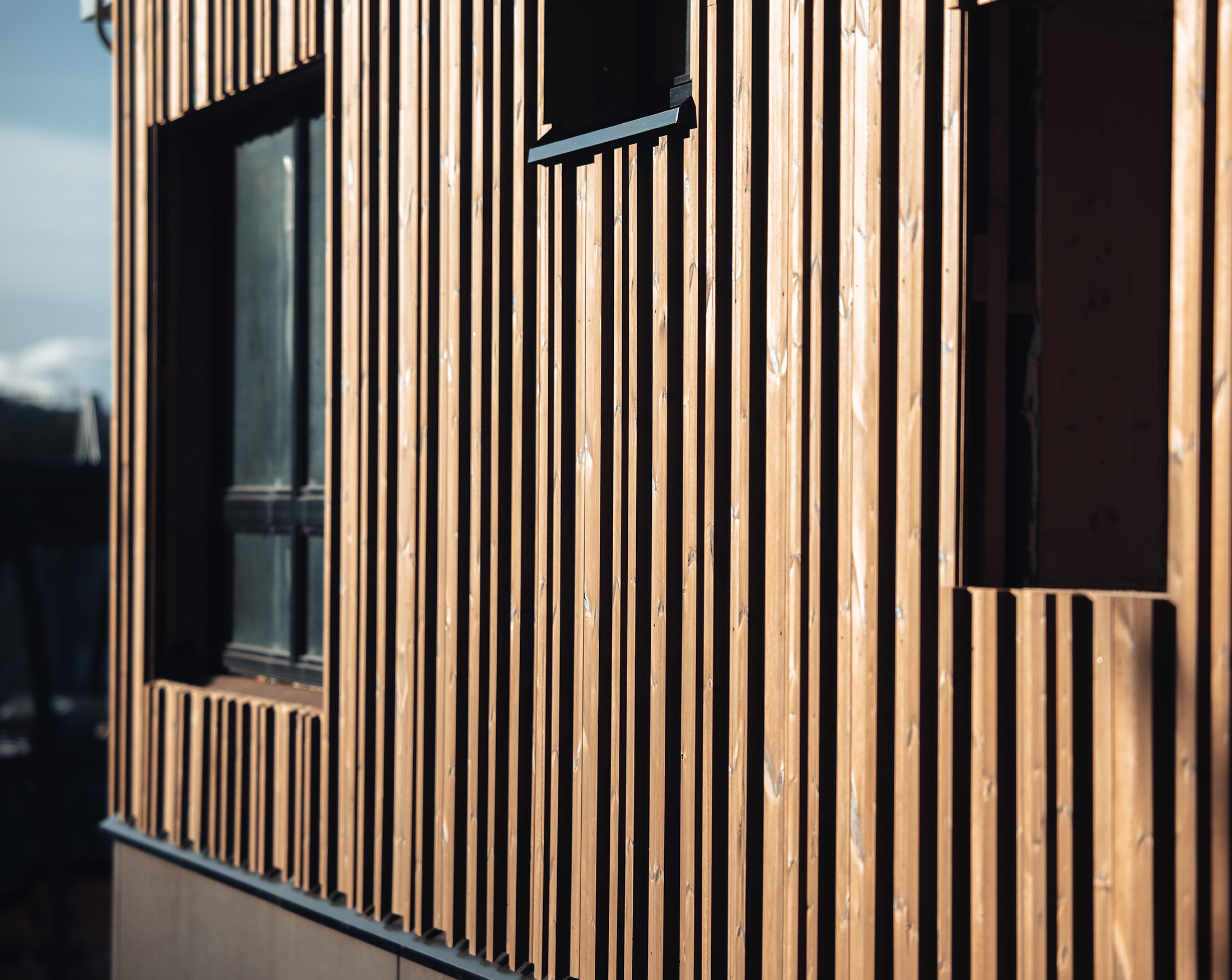 Im Fokus steht das Lunawood Panel System, das mit klaren Linien und chemikalienfrei behandeltem Thermoholz überzeugt. Das System bietet langlebige und dimensionsstabile Profile, die sich sowohl optisch als auch technisch ideal für zeitgemäße Fassadenlösungen eignen. Versteckte Befestigungen sorgen dafür, dass die schöne, homogene Erscheinung nicht gestört wird.