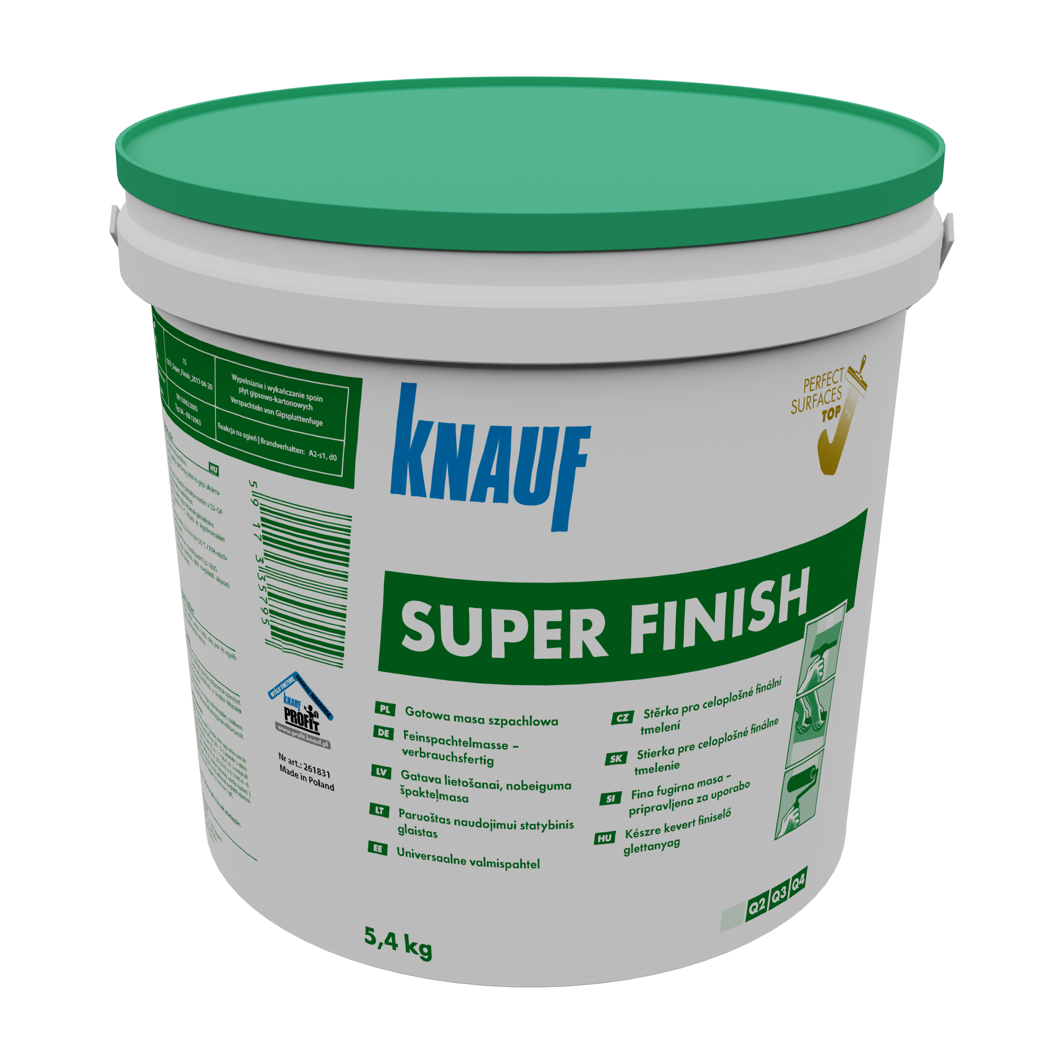 Knauf SuperFinish ist eine gebrauchsfertige Feinspachtelmasse für hochwertige Oberflächen (Q2/Q3/Q4) für Wand und Decke im Innenbereich und eignet sich für den Einsatz auf Gipskartonplatten, Gipsfaserplatten, zementgebundenen Platten, Beton und Putz sowie auf verschiedenen Altuntergründen. Die Spachelmasse kann händisch und maschinell verarbeitet werden.