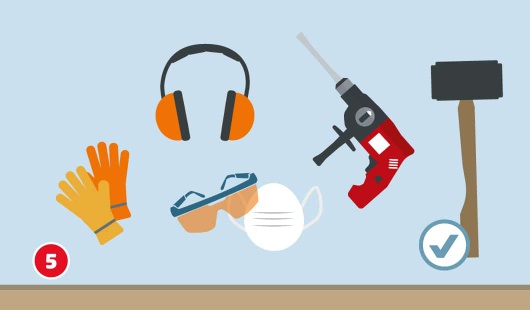Eine schematische Darstellung zeigt die benötigten Werkzeuge und Schutzkleidung für einen Wanddurchbruch. Abgebildet sind Arbeitshandschuhe, Gehörschutz, Schutzbrille mit Atemmaske, ein Bohrhammer und ein Gummihammer. Ein Häkchen markiert die Vollständigkeit der Ausstattung. Unten links ist ein roter Kreis mit einer weißen 5